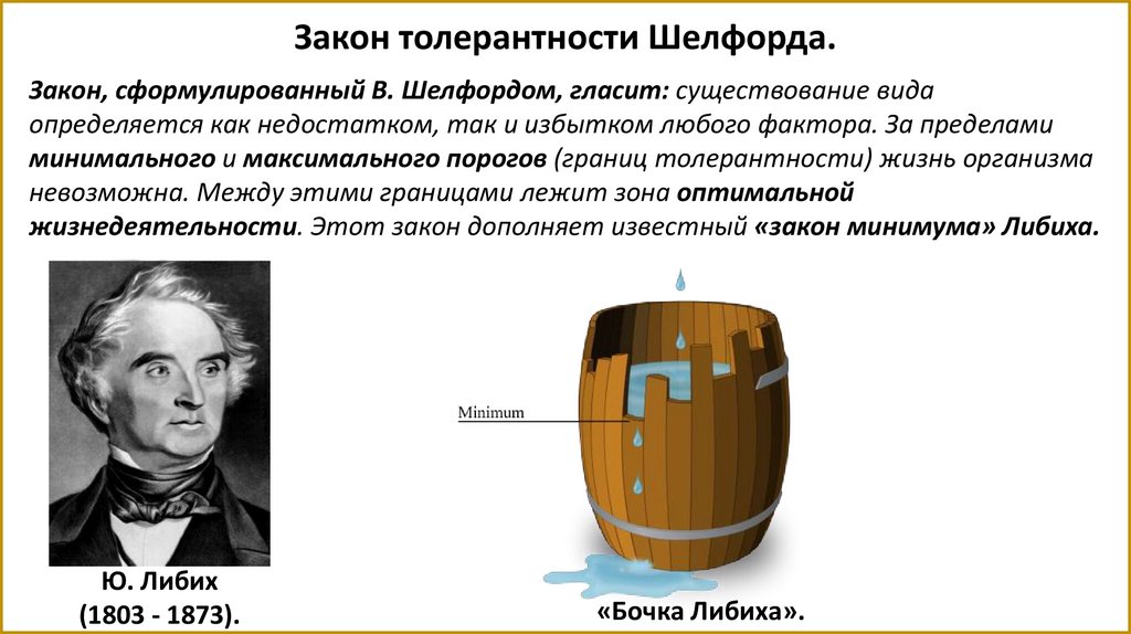 жизнедеятельности. Этот закон дополняет известный «закон минимума» Либиха.