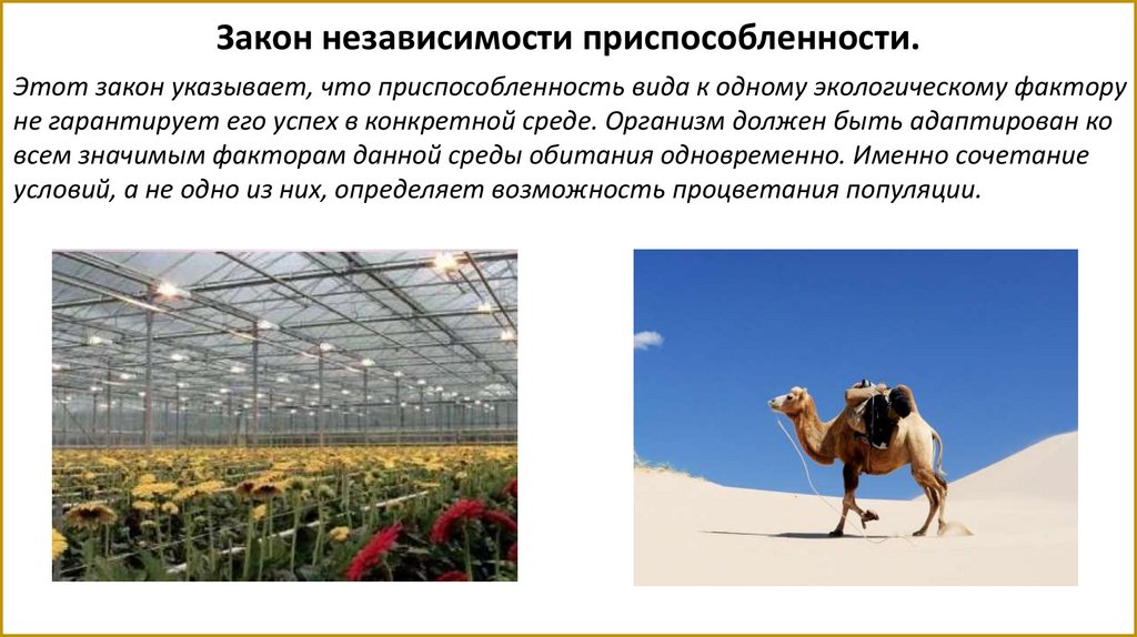 Закон независимости приспособленности.Этот закон указывает, что приспособленность вида к одному экологическому фактору