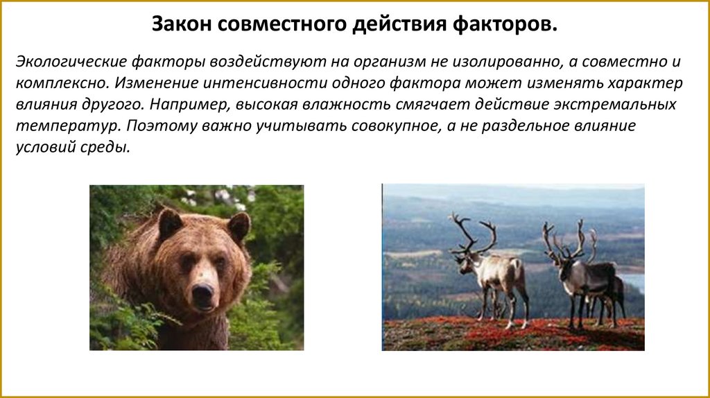 Закон совместного действия факторов.Экологические факторы воздействуют на организм не изолированно, а совместно и
