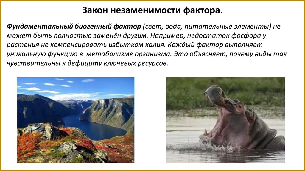 Закон незаменимости фактора.Фундаментальный биогенный фактор (свет, вода, питательные элементы) не