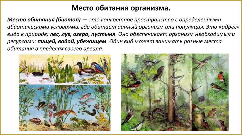 Место обитания организма.Место обитания (биотоп) — это конкретное пространство с определёнными