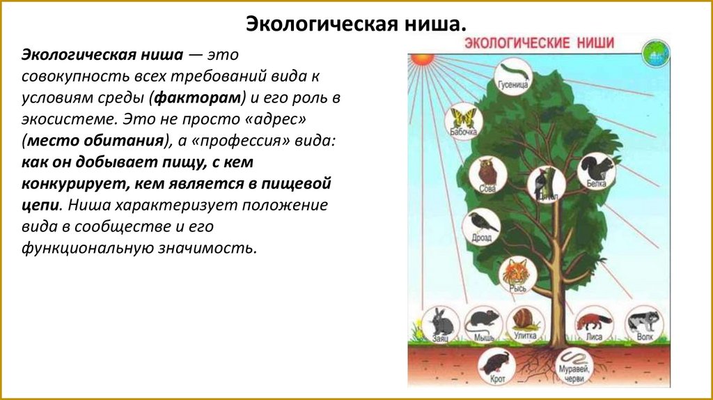 ресурсами: пищей, водой, убежищем. Один вид может занимать разные места