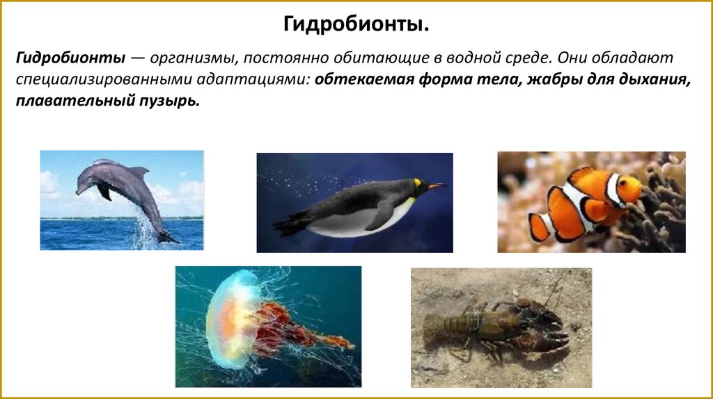 Гидробионты.Гидробионты — организмы, постоянно обитающие в водной среде. Они обладают