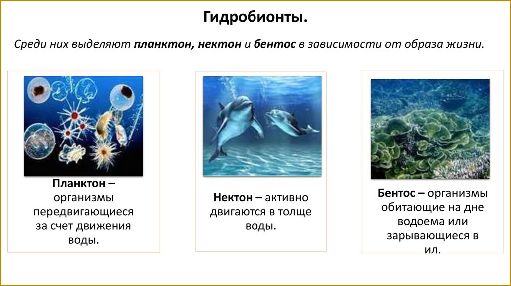 Гидробионты.Среди них выделяют планктон, нектон и бентос в зависимости от образа жизни.