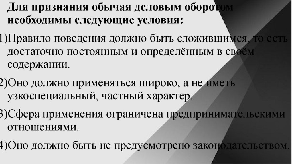 Для признания обычая деловым оборотомнеобходимы следующие условия: