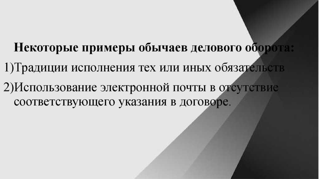 Некоторые примеры обычаев делового оборота:1)Традиции исполнения тех или иных обязательств