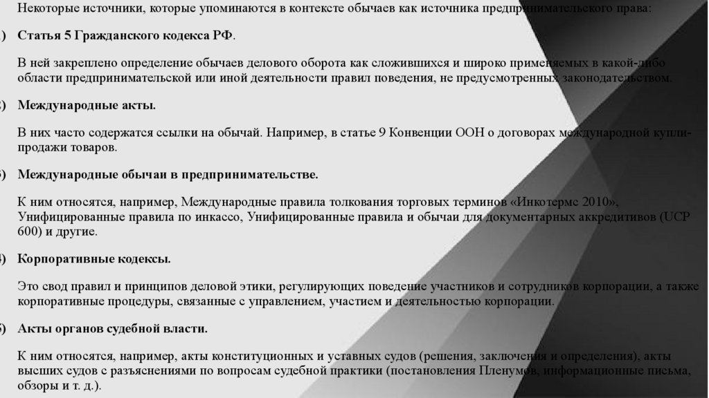 Некоторые источники, которые упоминаются в контексте обычаев как источника предпринимательского права:1) Статья 5 Гражданского кодекса РФ.