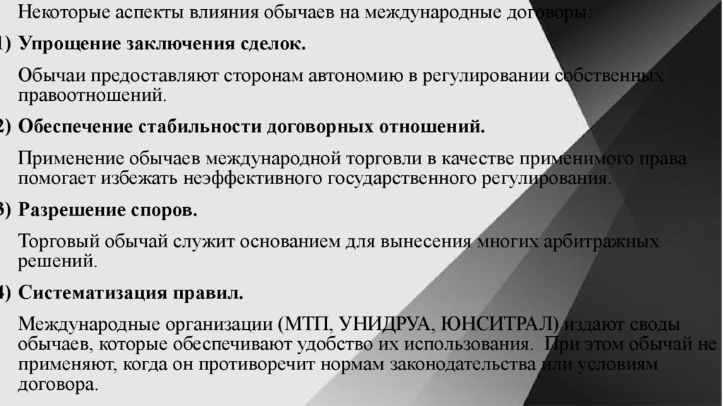 Некоторые аспекты влияния обычаев на международные договоры:1) Упрощение заключения сделок.