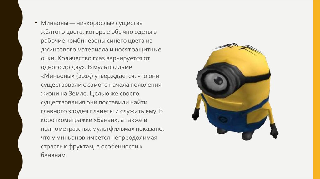 • Миньоны — низкорослые существажёлтого цвета, которые обычно одеты в