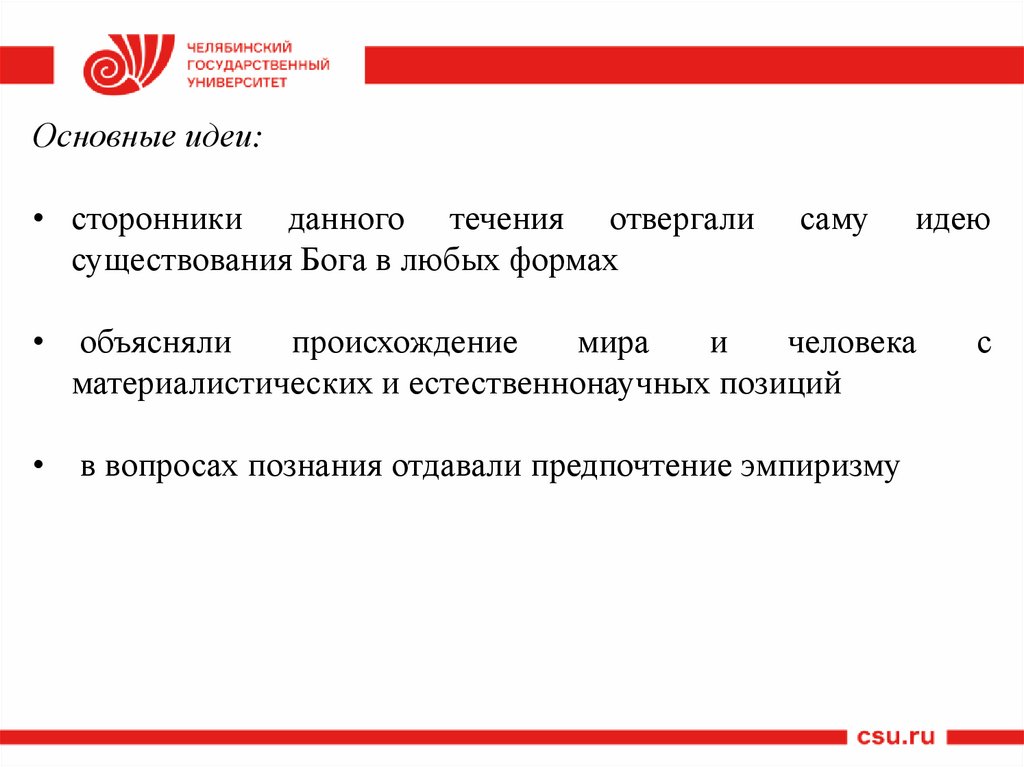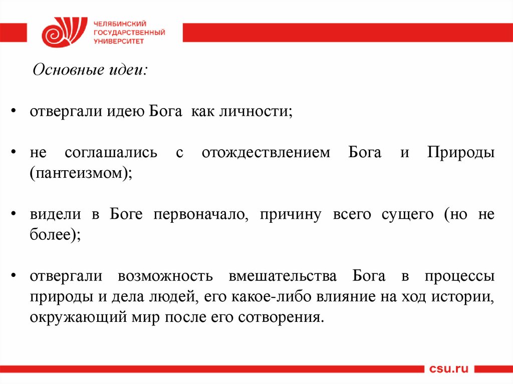 Основные идеи:• отвергали идею Бога как личности;