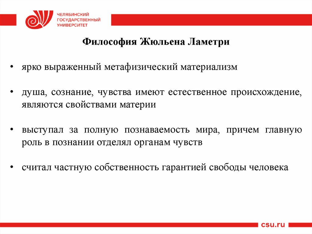 Философия Жюльена Ламетри• ярко выраженный метафизический материализм