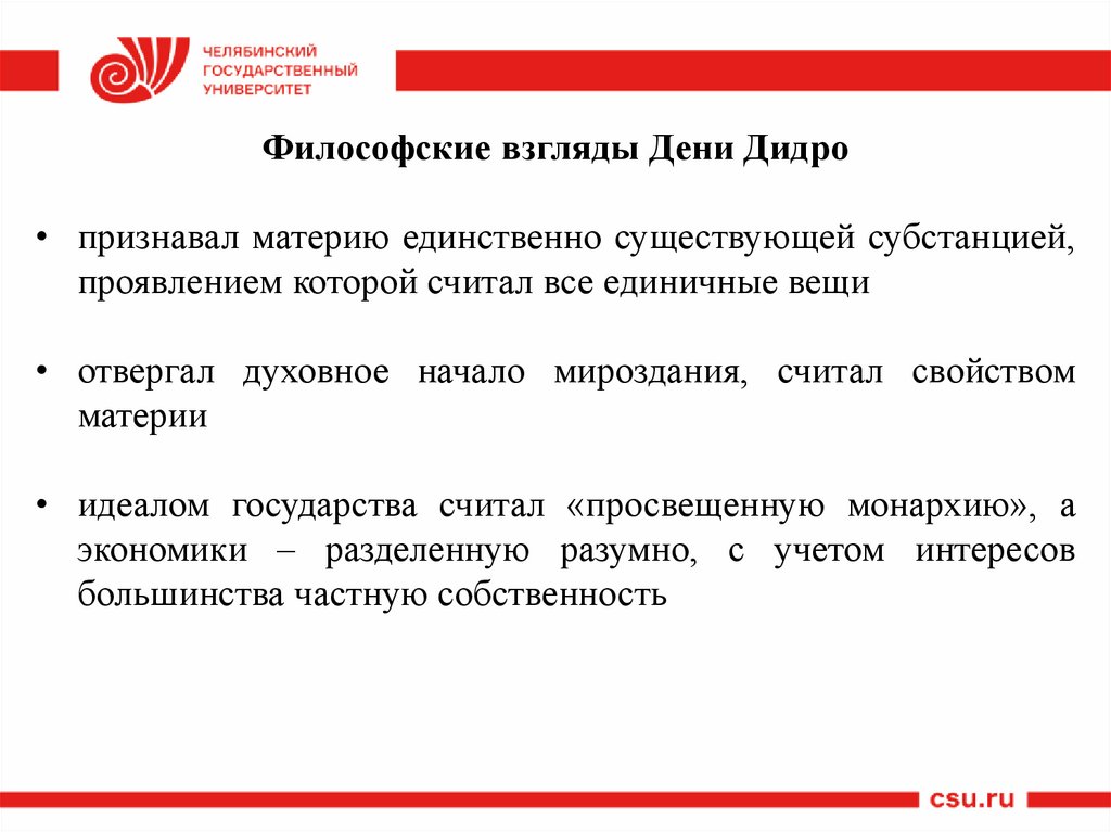 Философские взгляды Дени Дидро• признавал материю единственно существующей субстанцией,