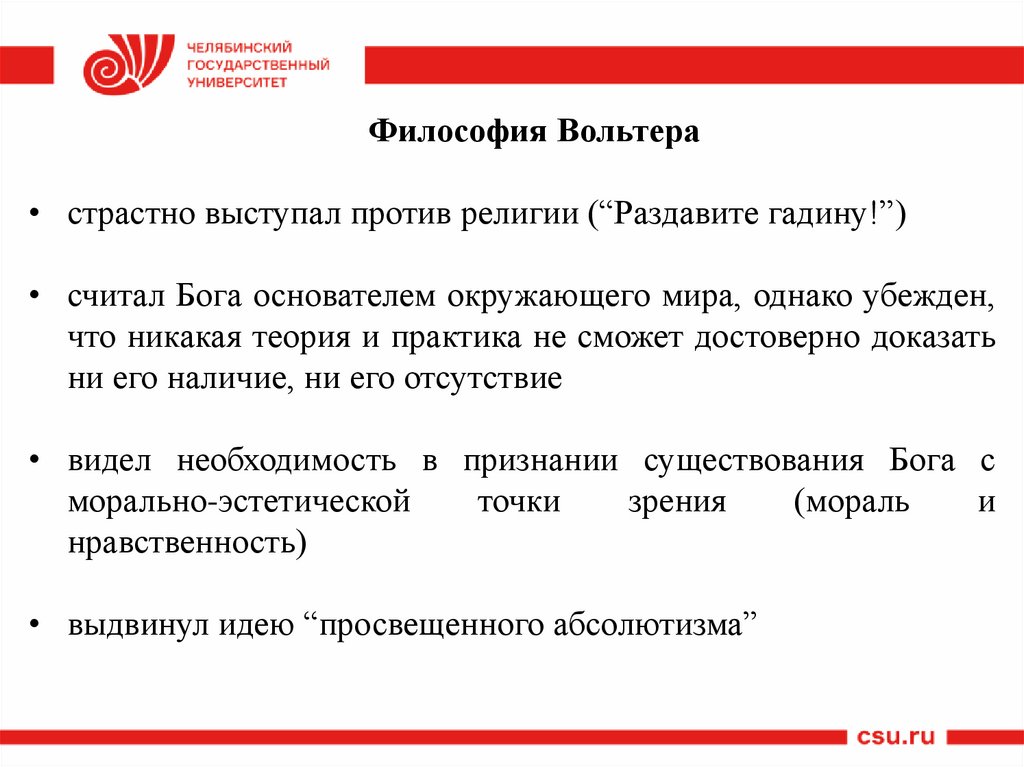 Философия Вольтера• страстно выступал против религии (“Раздавите гадину!”)