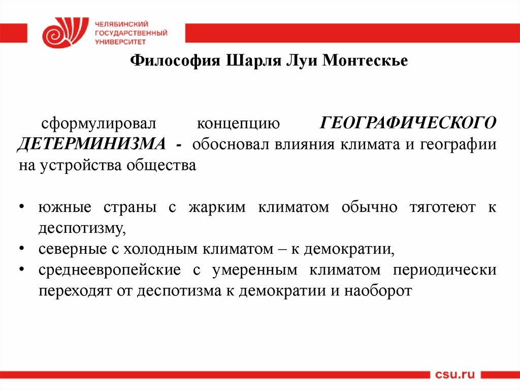 ДЕТЕРМИНИЗМА - обосновал влияния климата и географии