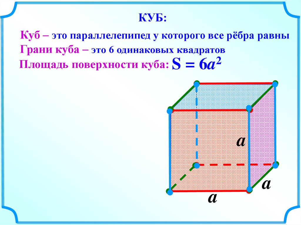 КУБ:Куб – это параллелепипед у которого все рёбра равны