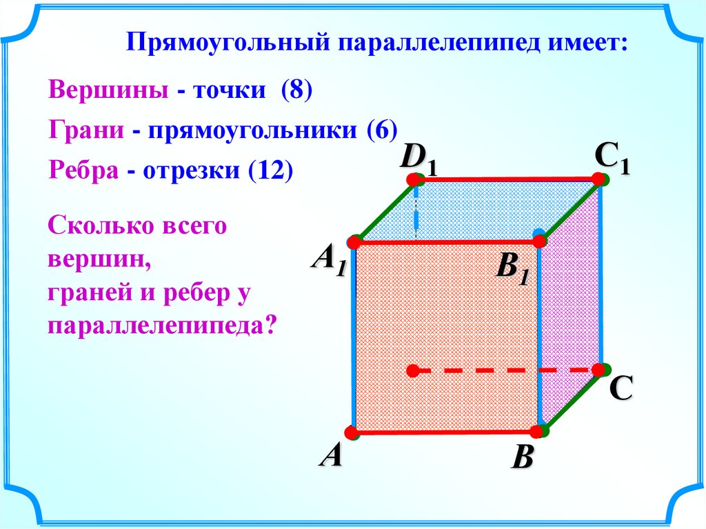 Прямоугольный параллелепипед имеет:Вершины - точки (8)