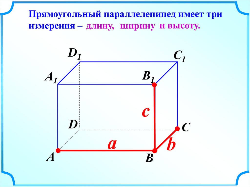 Прямоугольный параллелепипед имеет триизмерения – длину, ширину и высоту.