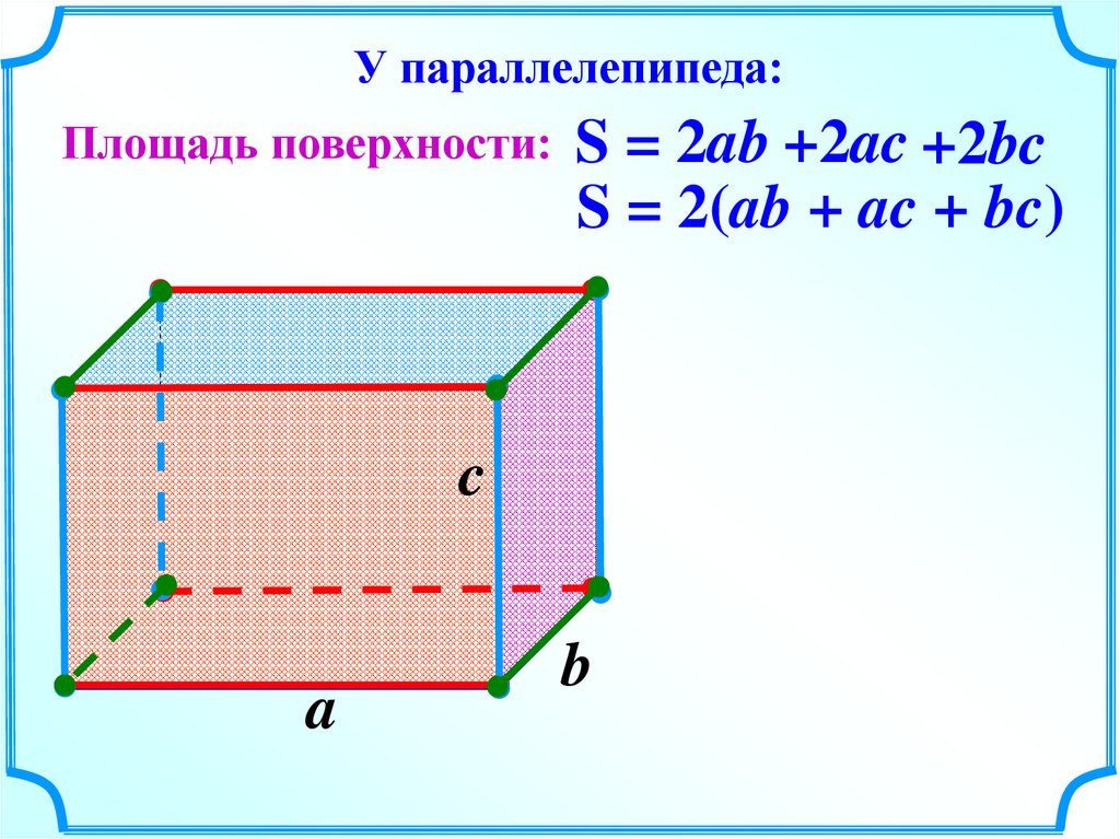 У параллелепипеда:Площадь поверхности: S = 2ab +2ac +2bc