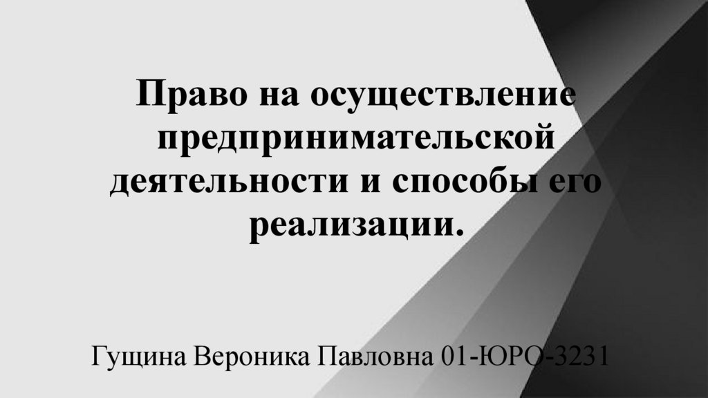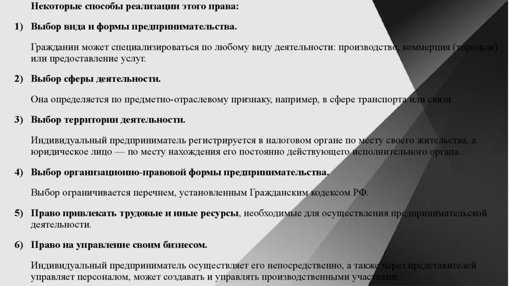 Некоторые способы реализации этого права:1) Выбор вида и формы предпринимательства.