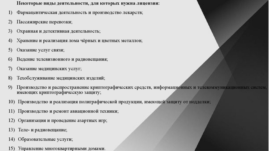 Некоторые виды деятельности, для которых нужна лицензия:1) Фармацевтическая деятельность и производство лекарств;