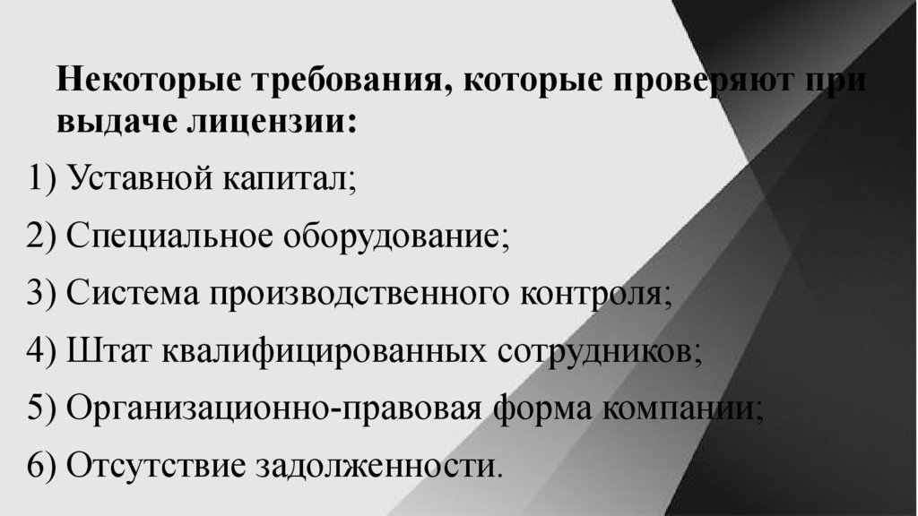 Некоторые требования, которые проверяют привыдаче лицензии: