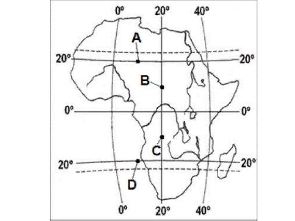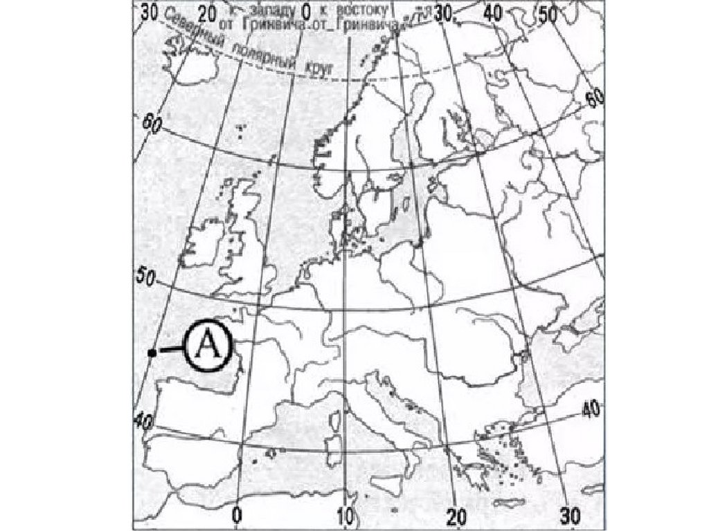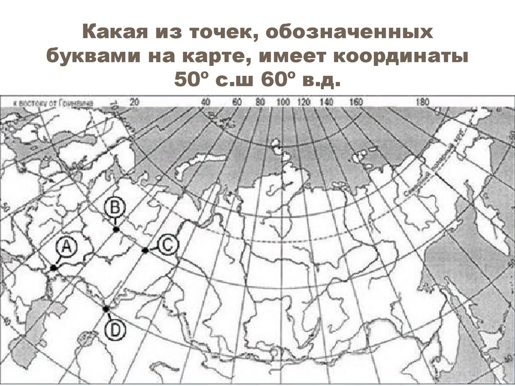 Какая из точек, обозначенныхбуквами на карте, имеет координаты