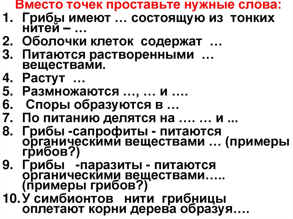 Вместо точек проставьте нужные слова:1. Грибы имеют … состоящую из тонких