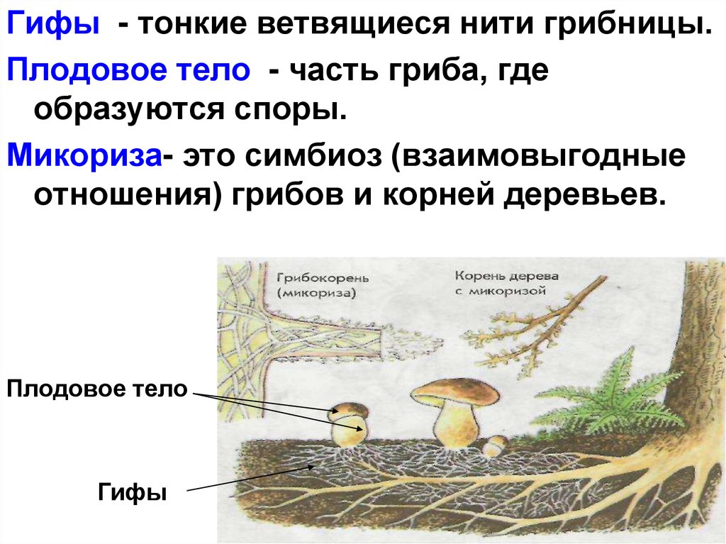 Гифы - тонкие ветвящиеся нити грибницы.Плодовое тело - часть гриба, где