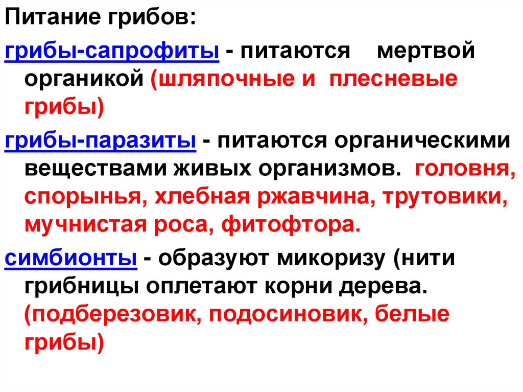 Питание грибов:грибы-сапрофиты - питаются мертвой
