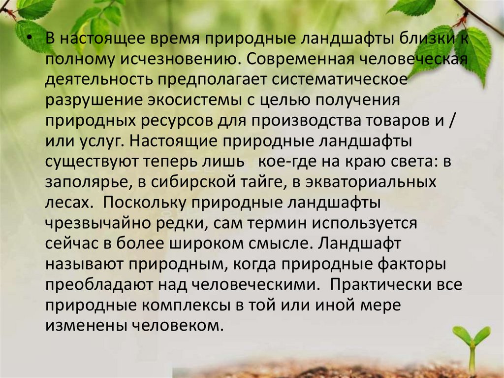 • В настоящее время природные ландшафты близки кполному исчезновению. Современная человеческая