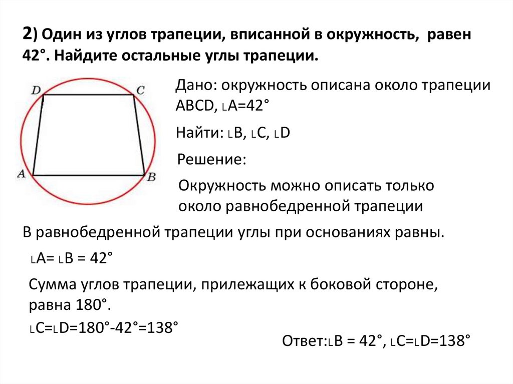 2) Один из углов трапеции, вписанной в окружность, равен42°. Найдите остальные углы трапеции.