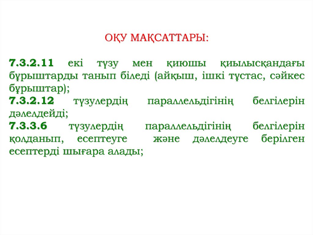ОҚУ МАҚСАТТАРЫ:7.3.2.11 екі түзу мен қиюшы қиылысқандағы
