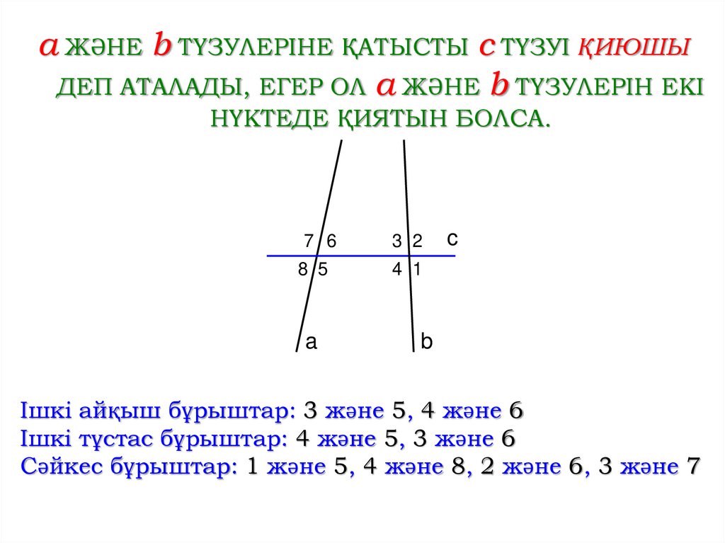 a ЖӘНЕ b ТҮЗУЛЕРІНЕ ҚАТЫСТЫ c ТҮЗУІ ҚИЮШЫДЕП АТАЛАДЫ, ЕГЕР ОЛ a ЖӘНЕ b ТҮЗУЛЕРІН ЕКІ