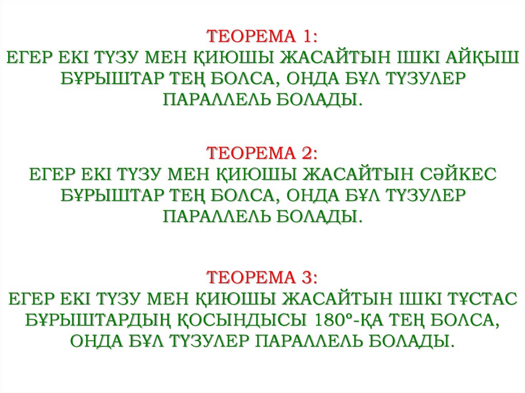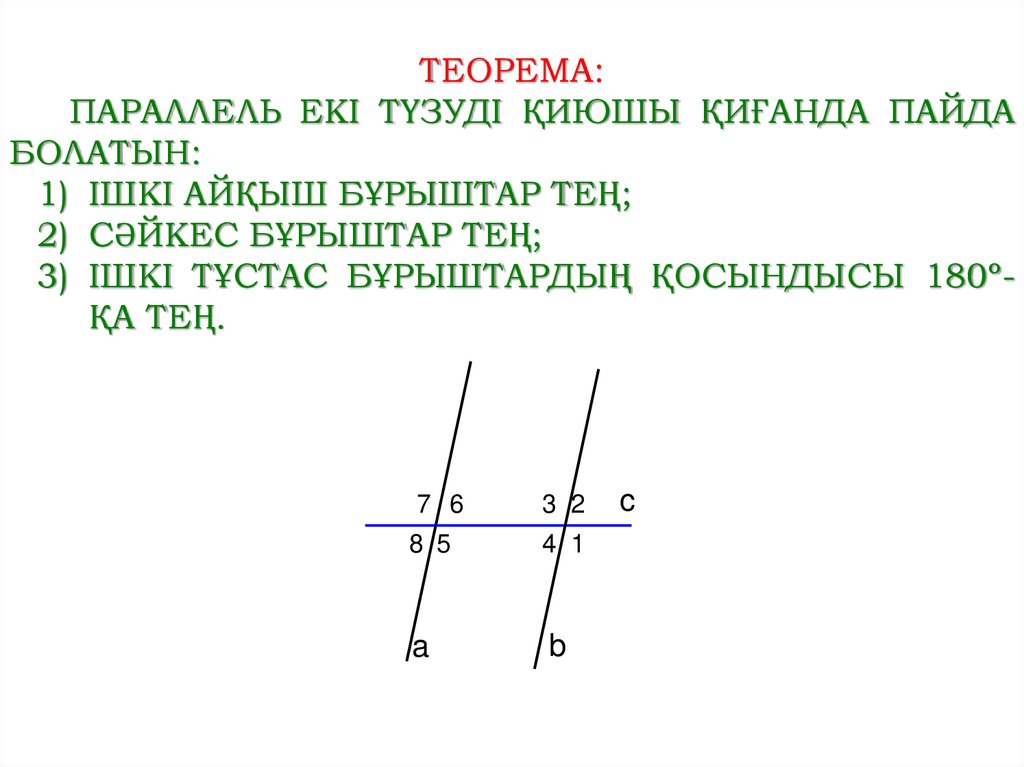 ТЕОРЕМА:ПАРАЛЛЕЛЬ ЕКІ ТҮЗУДІ ҚИЮШЫ ҚИҒАНДА ПАЙДА