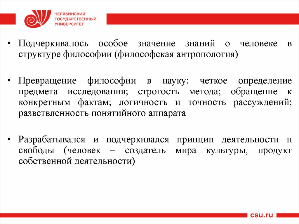 • Подчеркивалось особое значение знаний о человеке вструктуре философии (философская антропология)