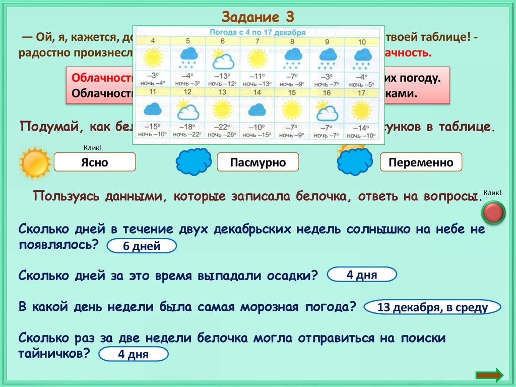 Задание 3— Ой, я, кажется, догадалась, что обозначают значки-рисунки в твоей таблице! радостно произнесла белочка-соседка. — Так ты обозначала облачность.
