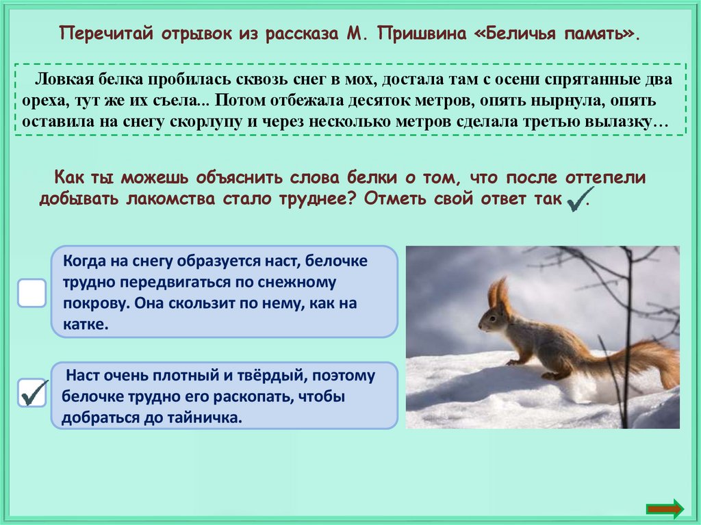 Перечитай отрывок из рассказа М. Пришвина «Беличья память».Ловкая белка пробилась сквозь снег в мох, достала там с осени спрятанные два