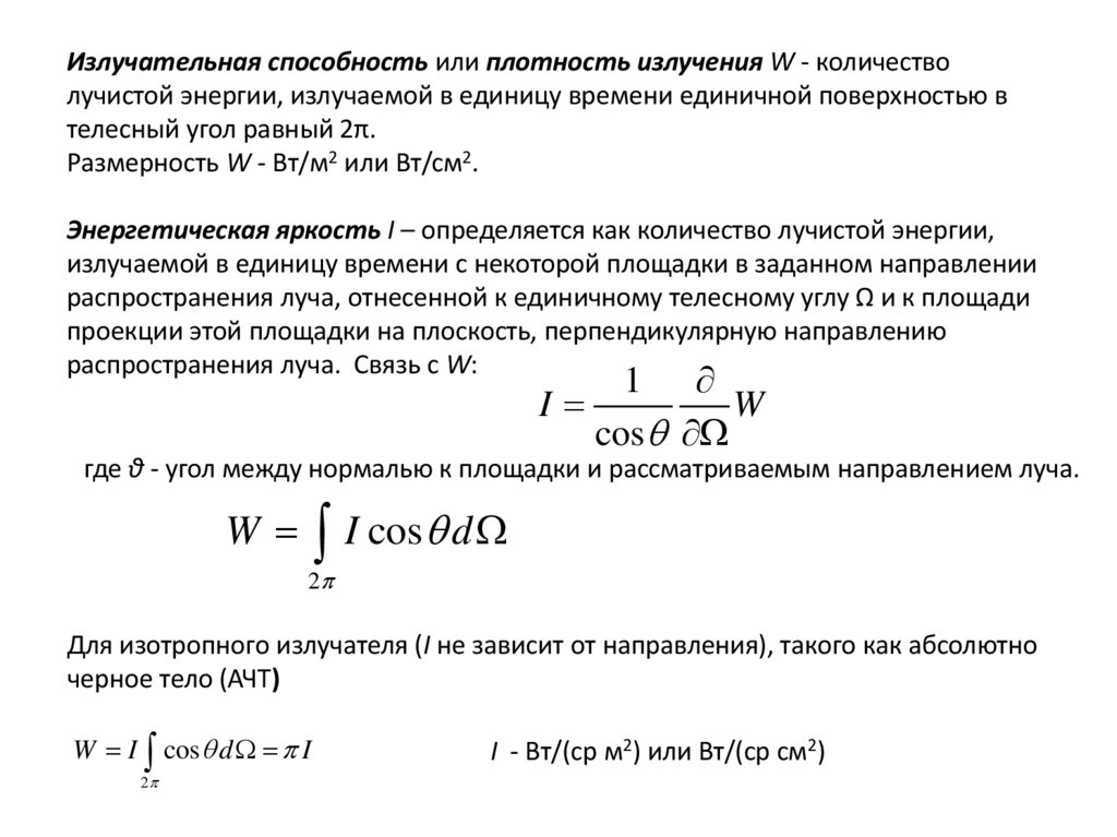Излучательная способность или плотность излучения W - количестволучистой энергии, излучаемой в единицу времени единичной поверхностью в