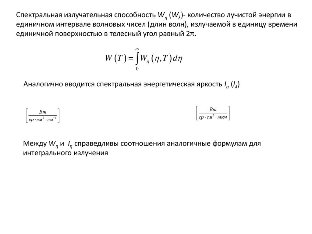 Спектральная излучательная способность Wη (Wλ)- количество лучистой энергии вединичном интервале волновых чисел (длин волн), излучаемой в единицу времени