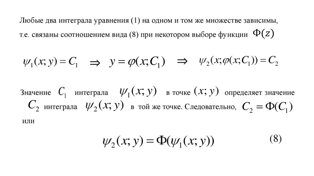 Любые два интеграла уравнения (1) на одном и том же множестве зависимы,т.е. связаны соотношением вида (8) при некотором выборе функции Φ(