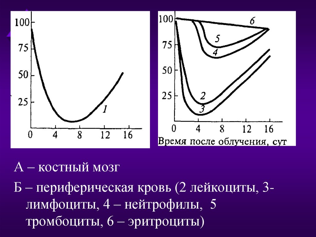 А – костный мозгБ – периферическая кровь (2 лейкоциты, 3лимфоциты, 4 – нейтрофилы, 5