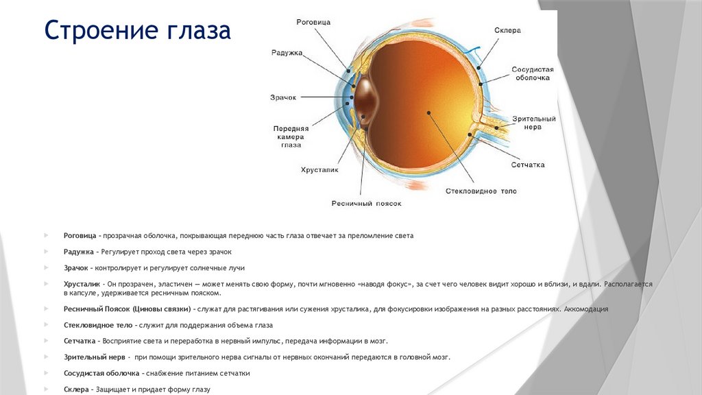 Строение глазаРоговица – прозрачная оболочка, покрывающая переднюю часть глаза отвечает за преломление света