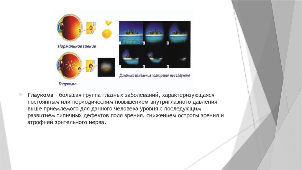 Глаукома – большая группа глазных заболеваний, характеризующаясяпостоянным или периодическим повышением внутриглазного давления