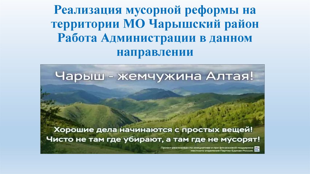 1. Реализация мусорной реформы на территории МО Чарышский район Работа Администрации в данном направлении