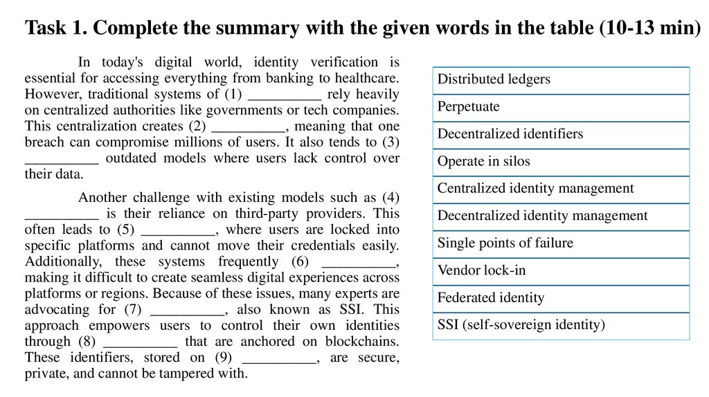 Task 1. Complete the summary with the given words in the table (10-13 min)In today's digital world, identity verification is