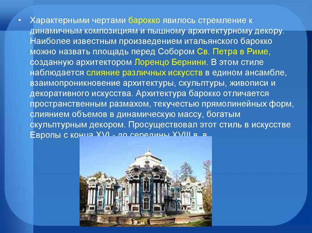 • Характерными чертами барокко явилось стремление кдинамичным композициям и пышному архитектурному декору.