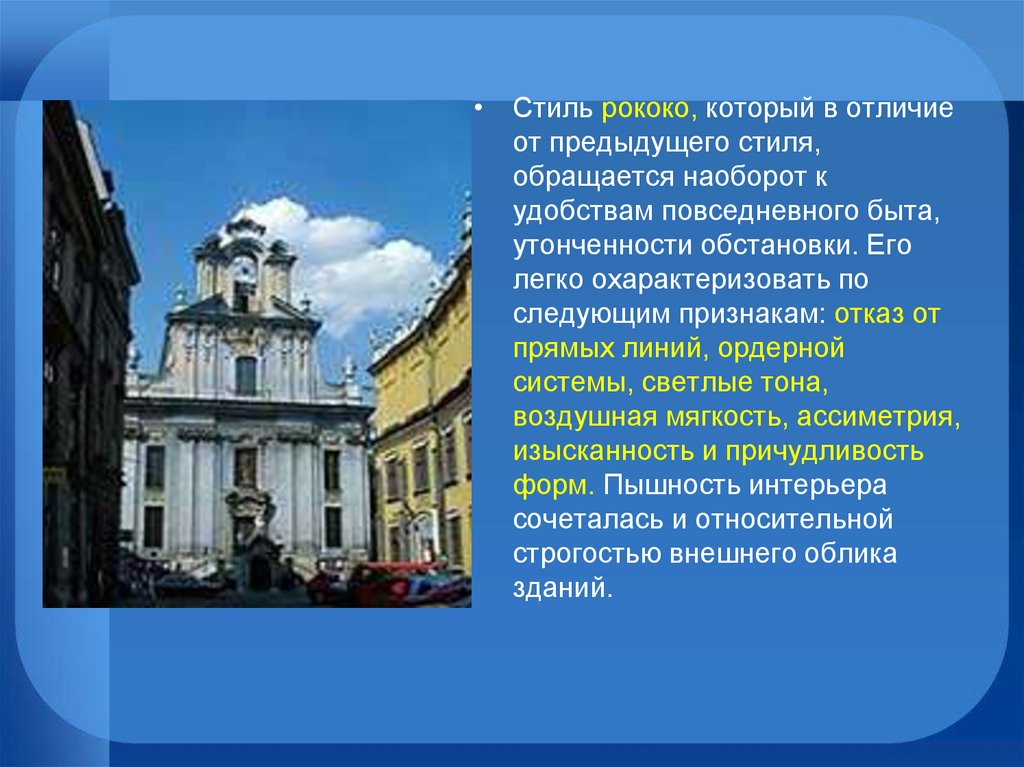 • Стиль рококо, который в отличиеот предыдущего стиля,