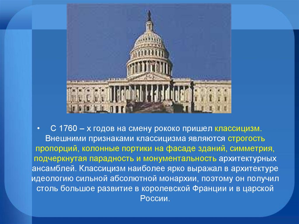 ансамблей. Классицизм наиболее ярко выражал в архитектуре