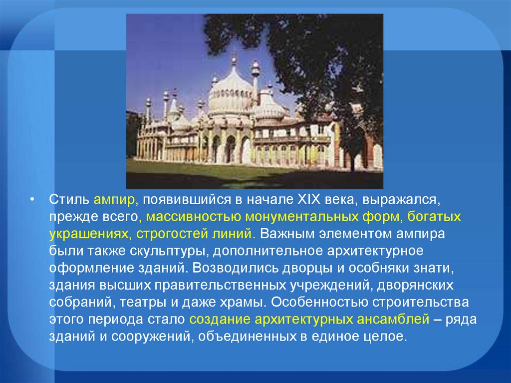 • Стиль ампир, появившийся в начале XIX века, выражался,прежде всего, массивностью монументальных форм, богатых