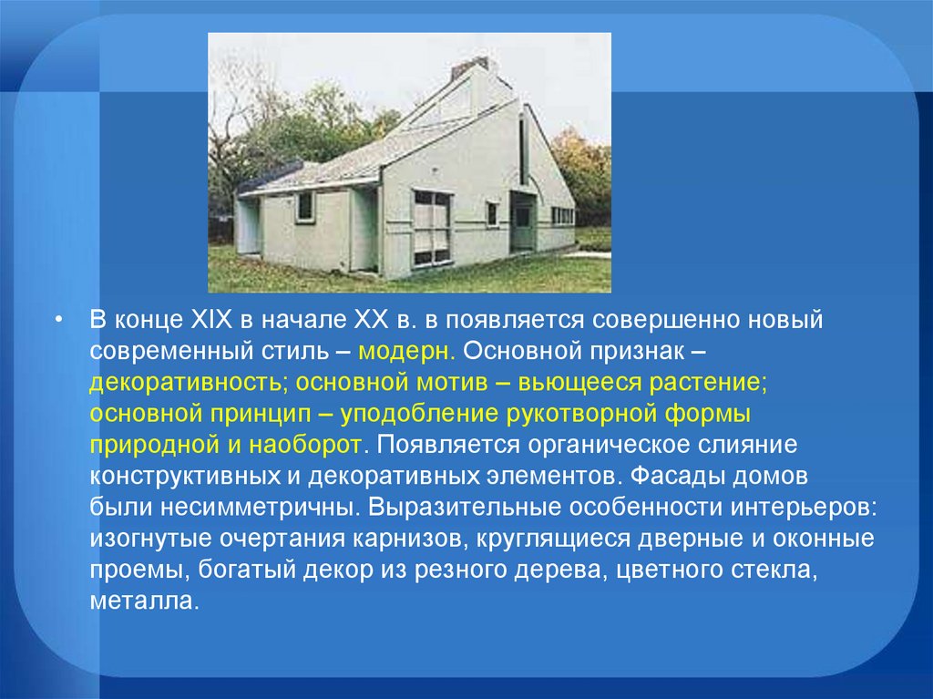 • В конце XIX в начале XX в. в появляется совершенно новыйсовременный стиль – модерн. Основной признак –